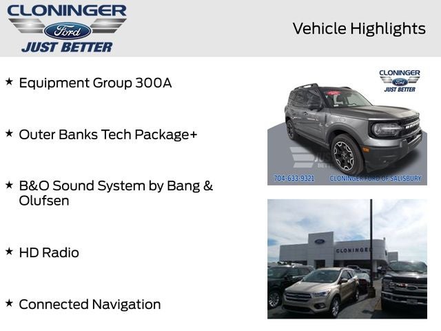 2025 Ford Bronco Sport Outer Banks B&O Sound System by Bang & Olufsen, Connected Navigation, Equipment Group 300A, HD Radio, Outer Banks Tech Package+. 25/30 City/Highway MPG ++ PRICE INCLUDES ALL REBATES AND FINANCING THRU FORD MOTOR CREDIT ++ Cloninger Ford Of Salisbury Will Pay TOP $$$ FOR YOUR TRADE-IN! ++ Cloninger Ford Of Salisbury – JUST BETTER!!! ++ Better People, Better Experience !!! One Year Appearance Package $1298 Not Included In Sales Price *PAINT PROTECTION Protects against fading, weather induced cracking or peeling, oxidation or loss of gloss. *FABRIC PROTECTION Protects against any normal oil-or water-based spills on the fabric. *VINYL & LEATHER PROTECTION Protects against fading and permanent staining caused by food or drink. Price includes: $2000 - Retail Customer Cash. Exp. 03/31/2026