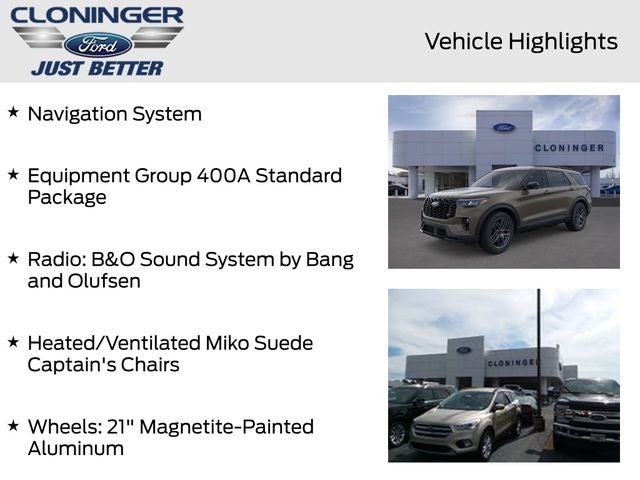 2026 Ford Explorer ST Equipment Group 400A Standard Package, Heated/Ventilated Miko Suede Captain's Chairs, Navigation System, Radio: B&O Sound System by Bang and Olufsen, Wheels: 21 Magnetite-Painted Aluminum. ++ PRICE INCLUDES ALL REBATES AND FINANCING THRU FORD MOTOR CREDIT ++ Cloninger Ford Of Salisbury Will Pay TOP $$$ FOR YOUR TRADE-IN! ++ Cloninger Ford Of Salisbury – JUST BETTER!!! ++ Better People, Better Experience !!! One Year Appearance Package $1298 Not Included In Sales Price *PAINT PROTECTION Protects against fading, weather induced cracking or peeling, oxidation or loss of gloss. *FABRIC PROTECTION Protects against any normal oil-or water-based spills on the fabric. *VINYL & LEATHER PROTECTION Protects against fading and permanent staining caused by food or drink. Price includes: $3500 - Retail Customer Cash. Exp. 03/31/2026