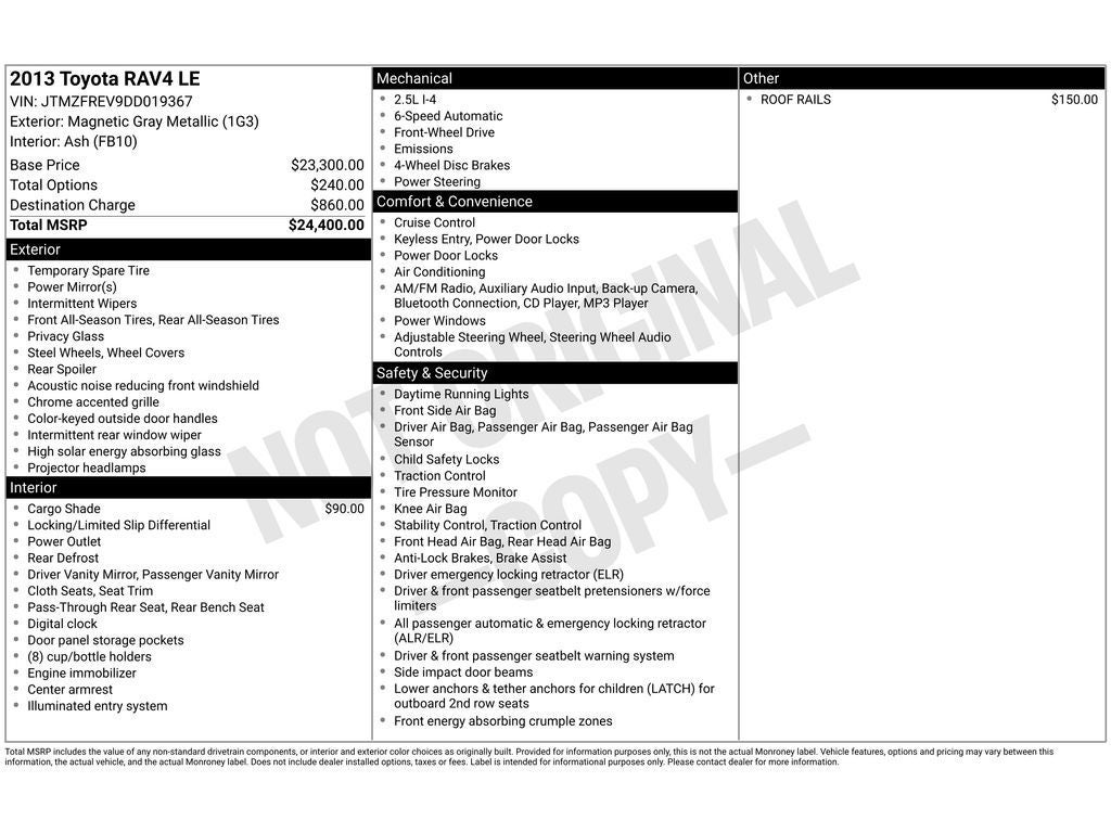 Our dealership has already run the CARFAX report and it is clean. A clean CARFAX is a great asset for resale value in the future. See what's behind you with the back up camera on this small suv. This 2013 Toyota RAV4 features a hands-free Bluetooth® phone system. Maintaining a stable interior temperature in this small suv is easy with the climate control system. This model has a 4 Cyl, 2.5L high output engine. This model is front wheel drive. This 2013 Toyota RAV4 projects refinement with a racy metallic gray exterior. Enjoy the tried and true gasoline engine in this 2013 Toyota RAV4 . The high efficiency automatic transmission shifts smoothly and allows you to relax while driving. Easily set your speed in this Toyota RAV4 with a state of the art cruise control system. Increase or decrease velocity with the touch of a button. Electronic Stability Control is one of many advanced safety features on this model.