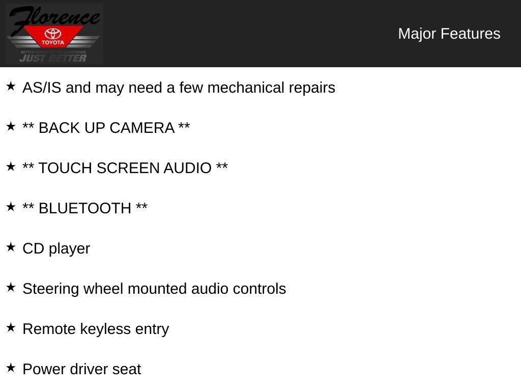 At Florence Toyota come see how our USED CARS are JUST BETTER . We offer the following benefits: Lifetime Power Train (Some exclusions apply), 1st Year Maintenance, $500 Additional Trade In Appraisal, 72 Hour Vehicle Exchange Program, Yearly Vehicle Appraisal & Safety Inspection, VIP Loyalty Program, Routine Express Service, Courtesy Service Shuttle, Express Buying Service. Also, as an added benefit we will buy your vehicle even if you don't buy ours!! Call today (866)830-0793or visit us at www.florencetoyota.com *Customer must trade-in a vehicle to receive $1,000 Trade Assist credit that is included in the online price. **Financing must be provided by a third-party lender using this dealership’s assistance for Customer to receive $1,000 Financing Assist credit that is included in the online price. See dealer for complete details.