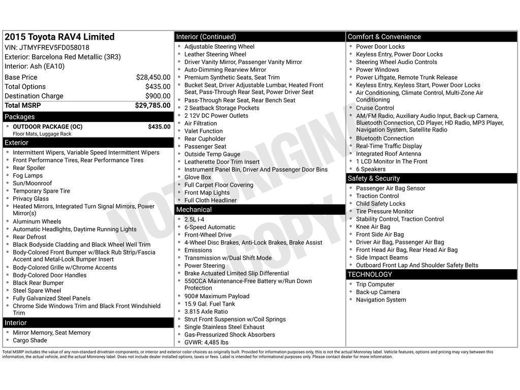 The perfect balance of space and size. the vehicle cruises through the city with ease. The leather seats in it are a must for buyers looking for comfort, durability, and style. With the adjustable lumbar support in this Toyota RAV4 your back will love you. You'll never again be lost in a crowded city or a country region with the navigation system on this Toyota RAV4. Load groceries and much more with ease into this 2015 Toyota RAV4 thanks to the power liftgate. Bluetooth® technology is built into the vehicle, keeping your hands on the steering wheel and your focus on the road. This 2015 Toyota RAV4 keeps you comfortable with Auto Climate. See what's behind you with the back up camera on this vehicle. The fog lights cut through the weather so you can see what's ahead.