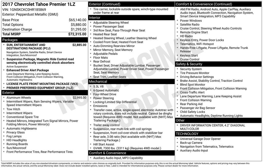 AS/IS and may need a few mechanical repairs, ** LEATHER SEATING **, ** MOONROOF / SUNROOF **, ** FACTORY NAVIGATION **, ** CLEAN CARFAX / NO ACCIDENTS **, ** BACK UP CAMERA **, ** SIRIUS RADIO **, ** PUSH BUTTON / KEYLESS START **, ** TOUCH SCREEN AUDIO **, ** HEATED SEATS **, ** COOLED SEATS **, ** POWER LIFTGATE **, ** 3RD ROW SEATING **, ** Bluetooth® **, ** 4WD / AWD **, ** BLIND SPOT MONITOR **, ** APPLE CAR PLAY / ANDROID AUTO **, ** PREMIUM AUDIO SYSTEM **, ** RAIN SENSING WIPERS **, ** RUNNING BOARDS **, Tahoe Premier, 4D Sport Utility, EcoTec3 5.3L V8, 6-Speed Automatic Electronic with Overdrive, 4WD, 1st & 2nd Row Color-Keyed Carpeted Floor Mats, 3rd Row 60/40 Power Fold Split-Bench, 4-Wheel Antilock Disc Brakes w/Brake Assist, Auto-Dimming Inside Rear-View Mirror, Automatic temperature control, Black Assist Steps w/Chrome Accent Strip, CD player, Color-Keyed Carpeting Floor Covering, Driver Inboard & Front Passenger Airbags, Enhanced Driver Alert Package (Y86), Enhanced Driver Information Center, Floor Console, Fog Lamps, Forward Collision Alert Sensor Indicator, Front & Rear Parking Assist, Front dual zone A/C, Front fog lights, Fully automatic headlights, Heated 2nd Row Seats, Heated Leather Wrapped Steering Wheel, IntelliBeam Headlamps, Lane Keep Assist, Low Speed Forward Automatic Braking, Magnetic Ride Control Suspension Package, Memory Settings, NavTraffic, OnStar Basic Plan For 5 Years, Passive Entry System, Power Release 2nd Row Bucket Seats, Power Tilt & Telescopic Steering Column, Power-Adjustable Accelerator & Brake Pedals, Power-Folding Heated Outside Mirrors, Preferred Equipment Group 1LZ, Rear air conditioning, Rear Cross-Traffic Alert, Rear Seat Blu-Ray/DVD Entertainment System, Remote keyless entry, Remote Vehicle Start, Roof-Mounted Luggage Rack Side Rails, Steering wheel mounted audio controls, Sun, Entertainment & Destinations Package, Universal Home Remote, Wireless Charging.