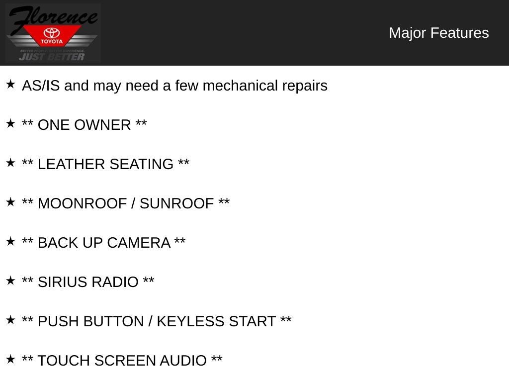 At Florence Toyota come see how our USED CARS are JUST BETTER . We offer the following benefits: Lifetime Power Train (Some exclusions apply), 1st Year Maintenance, $500 Additional Trade In Appraisal, 72 Hour Vehicle Exchange Program, Yearly Vehicle Appraisal & Safety Inspection, VIP Loyalty Program, Routine Express Service, Courtesy Service Shuttle, Express Buying Service. Also, as an added benefit we will buy your vehicle even if you don't buy ours!! Call today (866)830-0793or visit us at www.florencetoyota.com *Customer must trade-in a vehicle to receive $1,000 Trade Assist credit that is included in the online price. **Financing must be provided by a third-party lender using this dealership’s assistance for Customer to receive $1,000 Financing Assist credit that is included in the online price. See dealer for complete details.