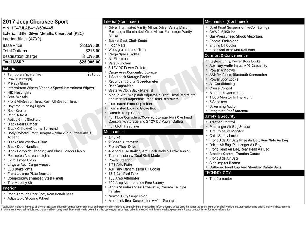 The Jeep Cherokee features a hands-free Bluetooth® phone system. Night driving with HID Xenon headlamps is a breeze in this unit. The HID headlamps on it light your way like never before. This unit has a 4 Cyl, 2.4L high output engine. This unit gleams with an elegant silver clear coated finish. Set the temperature exactly where you are most comfortable in this mid-size suv. The fan speed and temperature will automatically adjust to maintain your preferred zone climate. Front wheel drive on the Jeep Cherokee gives you better traction and better fuel economy. The Electronic Stability Control will keep you on your intended path. This 2017 Jeep Cherokee is equipped with a gasoline engine. This mid-size suv has an automatic transmission. Easily set your speed in this Jeep Cherokee with a state of the art cruise control system. Increase or decrease velocity with the touch of a button. This mid-sized SUV is perfect for your next adventure.