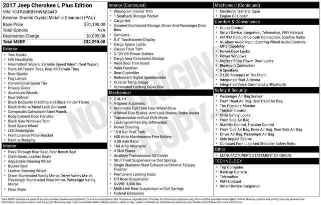 This 2017 Jeep Cherokee Trailhawk is the perfect blend of off-road prowess and refined comfort. Equipped with a powerful 2.4L I4 PZEV MultiAir engine and 9-speed automatic transmission, this Trailhawk model delivers impressive 4WD performance with an EPA-estimated 19 city/25 highway mpg.