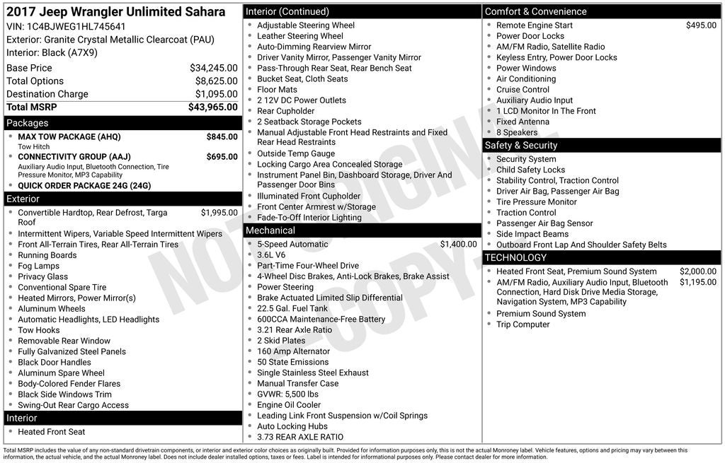 AS/IS and may need a few mechanical repairs, ** LEATHER SEATING **, ** SIRIUS RADIO **, ** TOUCH SCREEN AUDIO **, ** HEATED SEATS **, ** Bluetooth® **, ** 4WD / AWD **, ** PREMIUM AUDIO SYSTEM **, ** RUNNING BOARDS **, Wrangler Unlimited Sahara, 4D Sport Utility, 3.6L V6 24V VVT, 5-Speed Automatic, 4WD, 3.73 Rear Axle Ratio, Body Color Appliques Front Bumper, Body Color Appliques Rear Bumper, Body Color/Accent Color Grille, Class II Receiver Hitch, Connectivity Group, Front fog lights, Fully automatic headlights, Heated Front Seats, Max Tow Package, MOPAR Amaretto Leather & Premium Sound, Quick Order Package 23G, Quick Order Package 24G, Remote keyless entry, Remote USB Port, Steering wheel mounted audio controls, Tire Pressure Monitoring Display, Trailer Tow w/4-Pin Connector Wiring, Uconnect Voice Command w/Bluetooth®, Vehicle Information Center.