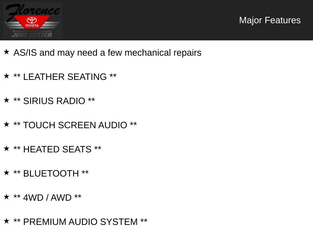 At Florence Toyota come see how our USED CARS are JUST BETTER . We offer the following benefits: Lifetime Power Train (Some exclusions apply), 1st Year Maintenance, $500 Additional Trade In Appraisal, 72 Hour Vehicle Exchange Program, Yearly Vehicle Appraisal & Safety Inspection, VIP Loyalty Program, Routine Express Service, Courtesy Service Shuttle, Express Buying Service. Also, as an added benefit we will buy your vehicle even if you don't buy ours!! Call today (866)830-0793or visit us at www.florencetoyota.com *Customer must trade-in a vehicle to receive $1,000 Trade Assist credit that is included in the online price. **Financing must be provided by a third-party lender using this dealership’s assistance for Customer to receive $1,000 Financing Assist credit that is included in the online price. See dealer for complete details.
