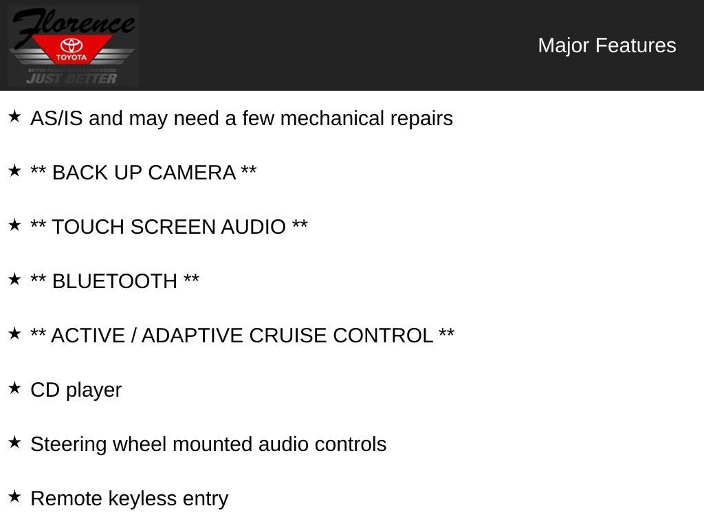 AS/IS and may need a few mechanical repairs, ** BACK UP CAMERA **, ** TOUCH SCREEN AUDIO **, ** Bluetooth® **, ** ACTIVE / ADAPTIVE CRUISE CONTROL **, Corolla LE ECO, 4D Sedan, 1.8L I4 DOHC, CVT, FWD, CD player, Remote keyless entry, Steering wheel mounted audio controls.