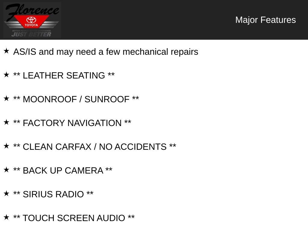 At Florence Toyota come see how our USED CARS are JUST BETTER . We offer the following benefits: Lifetime Power Train (Some exclusions apply), 1st Year Maintenance, $500 Additional Trade In Appraisal, 72 Hour Vehicle Exchange Program, Yearly Vehicle Appraisal & Safety Inspection, VIP Loyalty Program, Routine Express Service, Courtesy Service Shuttle, Express Buying Service. Also, as an added benefit we will buy your vehicle even if you don't buy ours!! Call today (866)830-0793or visit us at www.florencetoyota.com *Customer must trade-in a vehicle to receive $1,000 Trade Assist credit that is included in the online price. **Financing must be provided by a third-party lender using this dealership’s assistance for Customer to receive $1,000 Financing Assist credit that is included in the online price. See dealer for complete details.