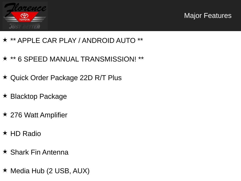 Blacktop Package: Black Fuel Filler Door; Gloss Black Instrument Panel Cluster Trim Rings; Rear Black Spoiler; HEMI Blacktop Fender Badge; Blacktop R/T Badge; 20" X 8.0" Gloss Black Painted Aluminum Wheels; Black-Edged Premium Floormats; Black Grille with Bezel; Challenger Blacktop Grille Badge. Quick Order Package 22D R/T Plus: 1-Year SiriusXM Radio Service; 276 Watt Amplifier; Integrated Center Stack Radio; For Details. Visit DriveUconnect.com; Heated Front Seats; For More Info. Call 800-643-2112; Bright Pedals; Shark Fin Antenna; Leather Trim Seats; Door Trim Panel with Ambient Lighting; Media Hub (2 USB. Aux); Heated Steering Wheel; 8.4" Touchscreen Display; Power Tilt/telescope Steering Column; SiriusXM Satellite Radio; HD Radio; Hectic Mesh Interior Accents; 1-Year SiriusXM Guardian Trial; Ventilated Front Seats; Universal Garage Door Opener; 6 Premium Speakers; ParkSense Rear Park Assist System; Nappa Leather Sport Seat; Rhombi 2 Piece Wheel Center Cap. Uconnect 4C Navigation Radio with 8.4" Display. **Equipment listed is based on original vehicle build and subject to change. Please confirm the accuracy of the included equipment by calling the dealer prior to purchase.**