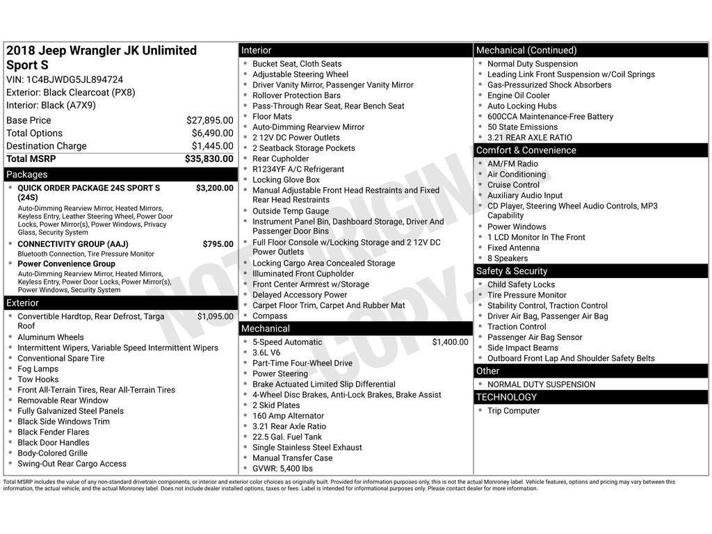 Power Convenience Group: Auto Dim Mirror with Reading Lamp; Front 1-Touch Down Power Windows; Power Heated Mirrors; Security Alarm; Power Locks; Remote Keyless Entry. Quick Order Package 24S Sport S: Chrome/leather Wrapped Shift Knob; P255/75R17 OWL On/off Road Tires; 17" X 7.5" Aluminum Wheels; Leather Wrapped Steering Wheel; Deep Tint Sunscreen Windows. Connectivity Group: Vehicle Information Center; Uconnect Voice Command with Bluetooth®; Tire Pressure Monitoring Display. Quick Order Package 23S Sport S: Chrome/leather Wrapped Shift Knob; P255/75R17 OWL On/off Road Tires; 17" X 7.5" Aluminum Wheels; Leather Wrapped Steering Wheel; Deep Tint Sunscreen Windows. Black 3-Piece Hard Top. **Equipment listed is based on original vehicle build and subject to change. Please confirm the accuracy of the included equipment by calling the dealer prior to purchase.**