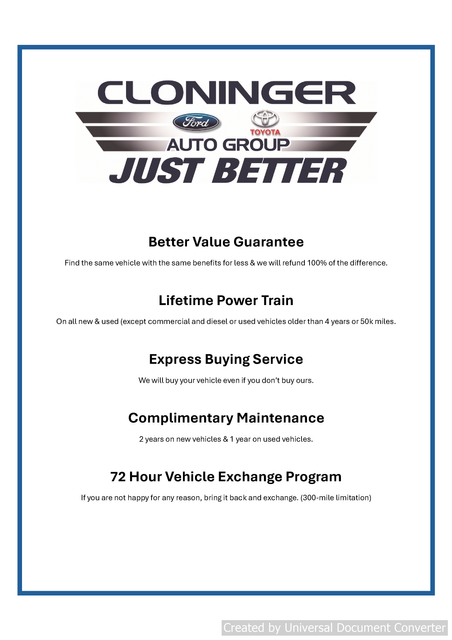 At Cloninger Ford of Morganton come see how we are your JUST BETTER dealership. We offer the following benefits: Better Value Guarantee,1st Year Maintenance, $500 Additional Trade In Appraisal, 72 Hour Vehicle Exchange Program, Yearly Vehicle Appraisal & Safety Inspection, VIP Loyalty Program, Routine Express Service, Courtesy Service Shuttle, Express Buying Service. Also, as a added benefit we will buy your vehicle even if you don't buy ours!! Call today (800)951-2277or visit us at www.cloningerfordofmorganton.com All pricing plus $1,299 Cloninger protection package and $899 documentation charge. All pricing includes discounts for dealer arranged financing.