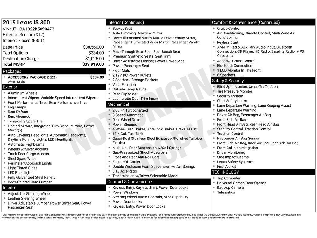 Discover luxury and sporty performance with this 2019 Lexus IS 300 Base, now available in Florence, SC. This rear-wheel-drive sedan pairs a responsive 2.0L 4-cylinder gasoline engine with refined Lexus engineering, delivering an engaging drive and confident handling for daily commuting or weekend escapes. Step inside to experience premium comfort with plush leather seats and automatic climate control that keeps the cabin perfectly tempered. The interior blends modern convenience with intuitive design, creating an inviting atmosphere for driver and passengers alike. Stay connected and hands-free with integrated Bluetooth®, enabling seamless audio streaming and phone calls while keeping your focus on the road. Advanced safety features include adaptive cruise control for relaxed highway driving and a blind spot monitor to enhance lane-change confidence. Together, these technologies deliver a thoughtful balance of convenience and protection. This Lexus IS 300 Base offers the signature Lexus attention to detail, including refined materials and a composed ride quality. Whether you're navigating city streets or cruising the interstate near Florence, SC, this sedan provides a sophisticated, driver-focused experience. Schedule a test drive today to feel the dynamic performance and upscale comfort of this 2019 Lexus IS 300. Contact us to arrange a viewing and learn more about this exceptional pre-owned luxury sedan located in Florence, SC.