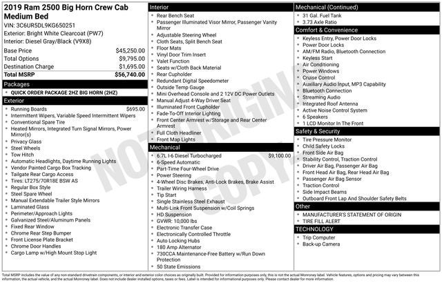 Quick Order Package 2HZ Big Horn, Quick Order Package 2ZZ Big Horn, 2 Way Rear Headrest Seat, 3.73 Axle Ratio, 4 Way Front Headrests, 4-Wheel Disc Brakes, 40/20/40 Split Bench Seat, 6 Speakers, ABS brakes, Active Noise Control System, Air Conditioning, AM/FM radio, Brake assist, Bumpers: chrome, Center Hub, Center Stack Storage Drawer, Chrome Flat Cab-Length Side Steps, Cloth 40/20/40 Bench Seat, Compass, Delay-off headlights, Driver door bin, Dual front impact airbags, Dual front side impact airbags, Electronic Stability Control, Electronically Controlled Throttle, Front anti-roll bar, Front Center Armrest w/Storage, Front reading lights, Fully automatic headlights, Heated door mirrors, Illuminated entry, Low tire pressure warning, Manual Adjust 4-Way Driver Seat, Manufacturer's Statement of Origin, Occupant sensing airbag, Outside temperature display, Overhead airbag, Overhead console, Panic alarm, ParkView Rear Back-Up Camera, Passenger door bin, Passenger vanity mirror, Power door mirrors, Power steering, Power windows, Radio data system, Radio: Uconnect 3 w/5 Display, Rear anti-roll bar, Rear Folding Seat, Rear seat center armrest, Rear step bumper, Remote keyless entry, Selectable Tire Fill Alert, Speed control, Tachometer, Tilt steering wheel, Tip Start, Tire Fill Alert (DISC), Traction control, Trip computer, Turn signal indicator mirrors, Variably intermittent wipers, Vendor Painted Cargo Box Tracking, Voltmeter, and Wheels: 18 x 8.0 Steel Chrome Clad.