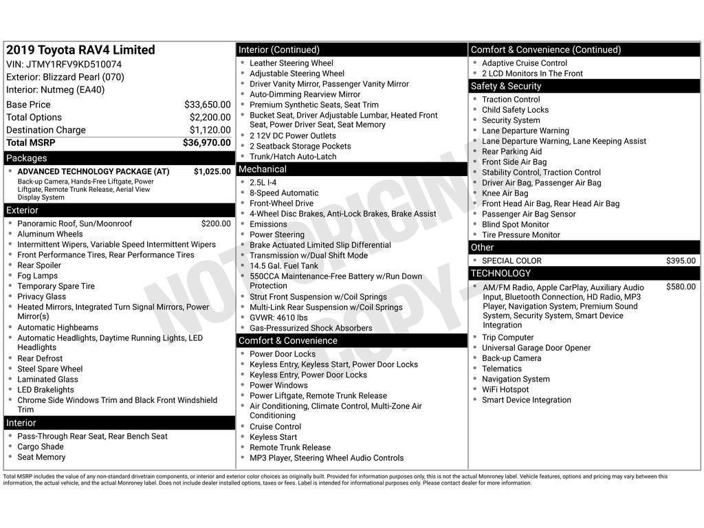 This vehicle offers Apple CarPlay for seamless connectivity. This 2019 Toyota RAV4 keeps you comfortable with Auto Climate. Protect this Toyota RAV4 from unwanted accidents with a cutting edge backup camera system. This vehicle's blind spot monitor enhances safety. This unit's Cross-Traffic Alert: Safeguarding you from unexpected traffic when reversing. This vehicle features cruise control for long trips. The Electronic Stability Control will keep you on your intended path. The Toyota RAV4 features a hands-free Bluetooth® phone system. The leather seats in this Toyota RAV4 are a must for buyers looking for comfort, durability, and style. With the adjustable lumbar support in it your back will love you. The installed navigation system will keep you on the right path. Load groceries and much more with ease into it thanks to the power liftgate. The vehicle comes with a sliding sunroof to let in sunshine and fresh air.