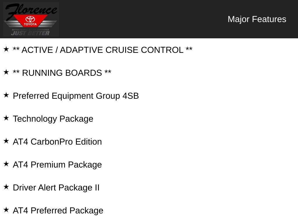 AT4 CarbonPro Edition: AT4 Carbon Hard Badge; Gloss Black Dual Exhaust Tips; MulitPro Audio System by Kicker; Unique Grille Surround with Black Chrome Finish; CarbonPro (carbon Fiber Composite) Bed. Driver Alert Package I: Ultrasonic Front and Rear Park Assist; Rear Cross Traffic Alert; Perimeter Lighting; Lane Change Alert with Side Blind Zone Alert. Driver Alert Package II: Forward Collision Alert; Lane Keep Assist with Lane Departure Warning; Front Pedestrian Braking; Following Distance Indicator; Automatic Emergency Braking; Safety Alert Seat; IntelliBeam Automatic High Beam On/off; Adaptive Cruise Control - Camera. AT4 Preferred Package: Premium Bose 7-Speaker Sound System; Power Sliding Rear Window with Rear Defogger; Wireless Charging; Universal Home Remote; Premium GMC Infotainment System Radio with Navigation. AT4 Premium Package: LT275/65R18C MT BW Tires. Technology Package: 8" Driver Information Center; HD Surround Vision with 2 Trailer View Camera Provisions; Multicolor 15" Diagonal Head-Up Display; High Gloss Black Mirror Caps; Bed View Camera; Rear Camera Mirror. Preferred Equipment Group 4SB: Hitch Guidance; 2 USB Ports (1st Row); Electric Rear-Window Defogger; Theft Deterrent System (unauthorized Entry); Body-Color Surround Grille; High-Capacity Air Filter; Skid Plates; Compass; 4.2" Diagonal Color Display Driver Info Center; 120-Volt Instrument Panel Power Outlet; Heated Driver and Front Outboard Passenger Seating; Color-Keyed Carpeting Floor Covering; OnStar and GMC Connected Services Capable; Heated 2nd Row Outboard Seats; Power Front Passenger Windows with Express Up/down; All-Weather Floor Liners with AT4 Logo; Power Rear Windows with Express Down; Integrated Trailer Brake Controller; Ventilated Driver and Front Passenger Seats; 18" X 8.5" Machined Aluminum Wheels; Manual Tilt-Wheel and Telescoping Steering Column; HD Rear Vision Camera; LED Cargo Area Lighting; Remote Vehicle Starter System; Hill Descent Control; Floor-Mounted Center Console; 170 Amp Alternator; Auxiliary External Transmission Oil Cooler; Electrical Lock Control Steering Column; Trailering Package; Off-Road Suspension; Steering Wheel Audio Controls; GMC Connected Access Capable; 2-Speed Transfer Case; Deep-Tinted Glass; Spray-On Pickup Bed Liner with AT4 Logo; HD Radio; Red Recovery Hooks; Power Front Windows with Driver Express Up/down; Rear Dual USB Charging-Only Ports; Keyless Open and Start; 4G LTE Wi-Fi Hotspot Capable; ProGrade Trailering System; Rear Wheelhouse Liners; 12-Volt Rear Auxiliary Power Outlet; 2 USB Ports; Heavy-Duty Rear Locking Differential; Power Door Locks. Power Sunroof. Black Off-Road Accessory Assist Step. MulitPro Audio System by Kicker. LT275/65R18C MT BW Tires. Bed View Camera. Trailer Tire Pressure Monitor System. **Equipment listed is based on original vehicle build and subject to change. Please confirm the accuracy of the included equipment by calling the dealer prior to purchase.**