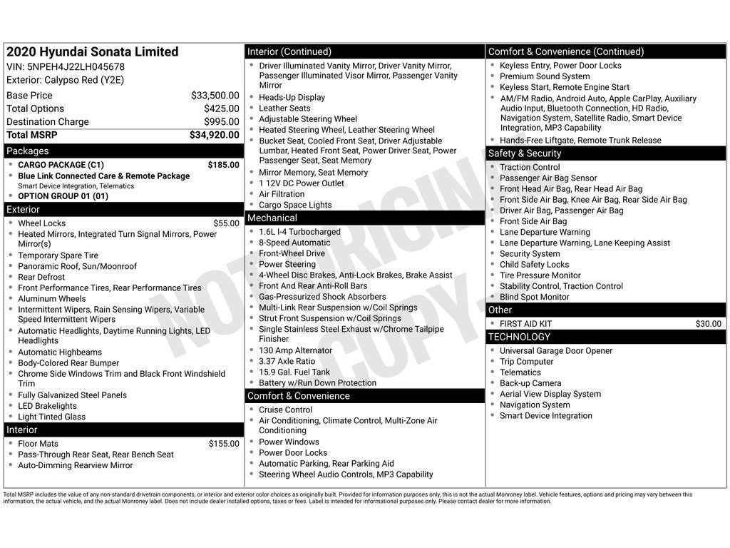 This unit keeps you comfortable with Auto Climate. Bluetooth® technology is built into the vehicle, keeping your hands on the steering wheel and your focus on the road. Engulf yourself with the crystal clear sound of a BOSE sound system in the Hyundai Sonata. See what's behind you with the back up camera on this vehicle. The Hyundai Sonata offers Apple CarPlay for seamless connectivity. You'll never again be lost in a crowded city or a country region with the navigation system on this model. This model offers Android Auto for seamless smartphone integration. The leather seats in this 2020 Hyundai Sonata are a must for buyers looking for comfort, durability, and style. Start this unit from inside with remote start. Keep your hands warm all winter with a heated steering wheel in this vehicle . The vehicle excites both driver and bystanders with a polished red exterior with racy lines.