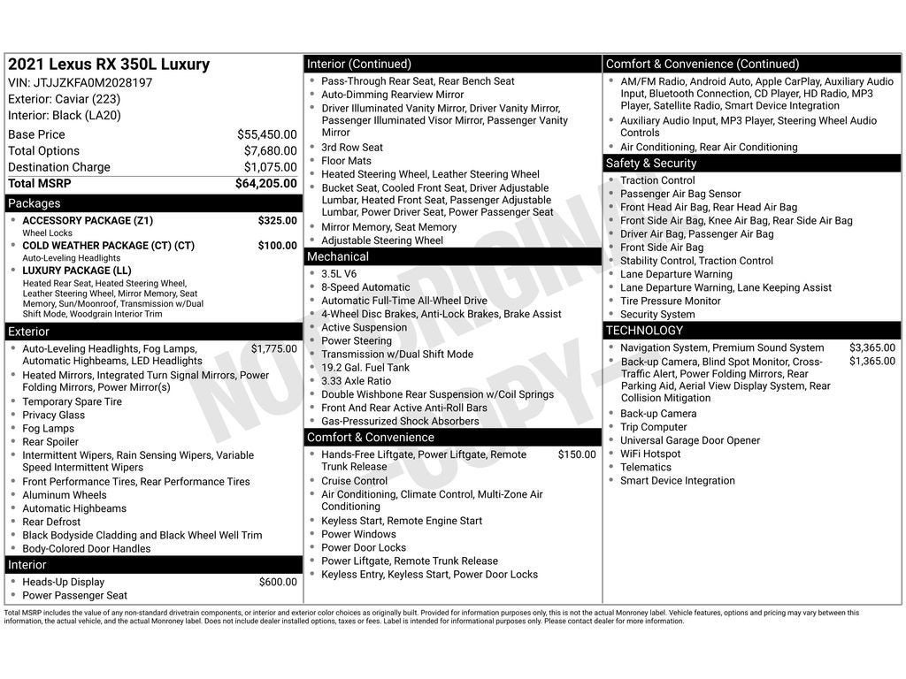 Luxury Pkg: Semi-Aniline Leather-trim Seats. 10-way Power Front Seats + Lumbar w/Driver Seat Memory. Rear Door Sun Shades. LED Ambient Lighting 20" Superchrome Alloy Wheels. Wood w/Aluminum Ornamentation. Heated Wood Steering Wheel: Tilt and Slide Moonroof/sunroof; Manual Rear Side-Door Sunshades; Finish Plate Door Inner Garnish; Heated Rear Seats; Wood with Illumination Door Trim; Return Easy-Access Power; Premium Heated Wood Steering Wheel. Cargo Net. Cargo Mat. Wheel Locks & Key Glove: Alloy Wheel Locks; Cargo Net; Key Gloves; Carpet Cargo Mat. 12.3" Navigation System with Mark Levinson Audio. Premium Triple-Beam LED Headlamps. Panoramic View Monitor with Rear Cross-Traffic Alert. Color Hi-Grade Head-Up Display. Rear Cross-Traffic Alert with Braking. Touch-Free Power Back Door with Kick Sensor. Carpet Cargo Mat. Cold Weather Package. Alloy Wheel Locks. Cargo Net. Key Gloves. **Equipment listed is based on original vehicle build and subject to change. Please confirm the accuracy of the included equipment by calling the dealer prior to purchase.**