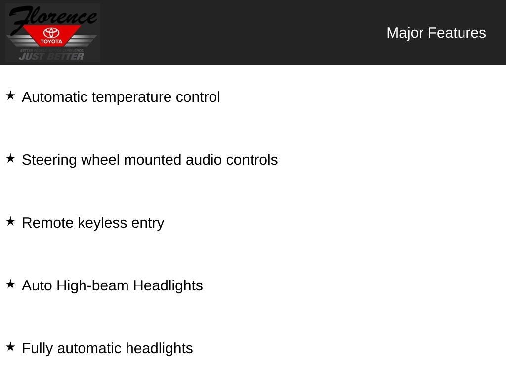 At Florence Toyota, we take pride in offering our customers the finest pre-owned vehicles on the market. Come see how our USED CARS are JUST BETTER. We offer the following benefits: Lifetime Powertrain (Some exclusions apply), 1st Year Maintenance, $500 Additional Trade-In Appraisal, 72-Hour Vehicle Exchange Program, Yearly Vehicle Appraisal & Safety Inspection, VIP Loyalty Program, Routine Express Service, Courtesy Service Shuttle, and Express Buying Service. Also, as an added benefit, we will buy your vehicle even if you don't buy ours!! Call today (866)830-0793 or visit us at www.florencetoyota.com *Customer must trade-in a vehicle to receive $1,000 Trade Assist credit that is included in the online price. **Financing must be provided by a third-party lender using this dealership's assistance for Customer to receive $1,000 Financing Assist credit that is included in the online price. See dealer for complete details.