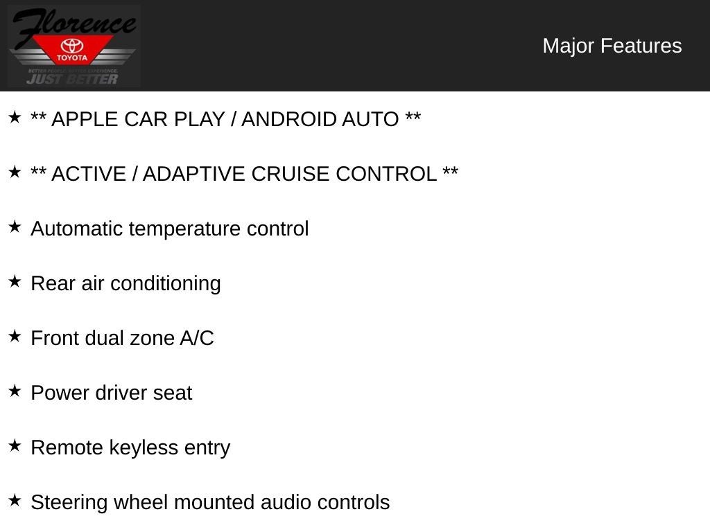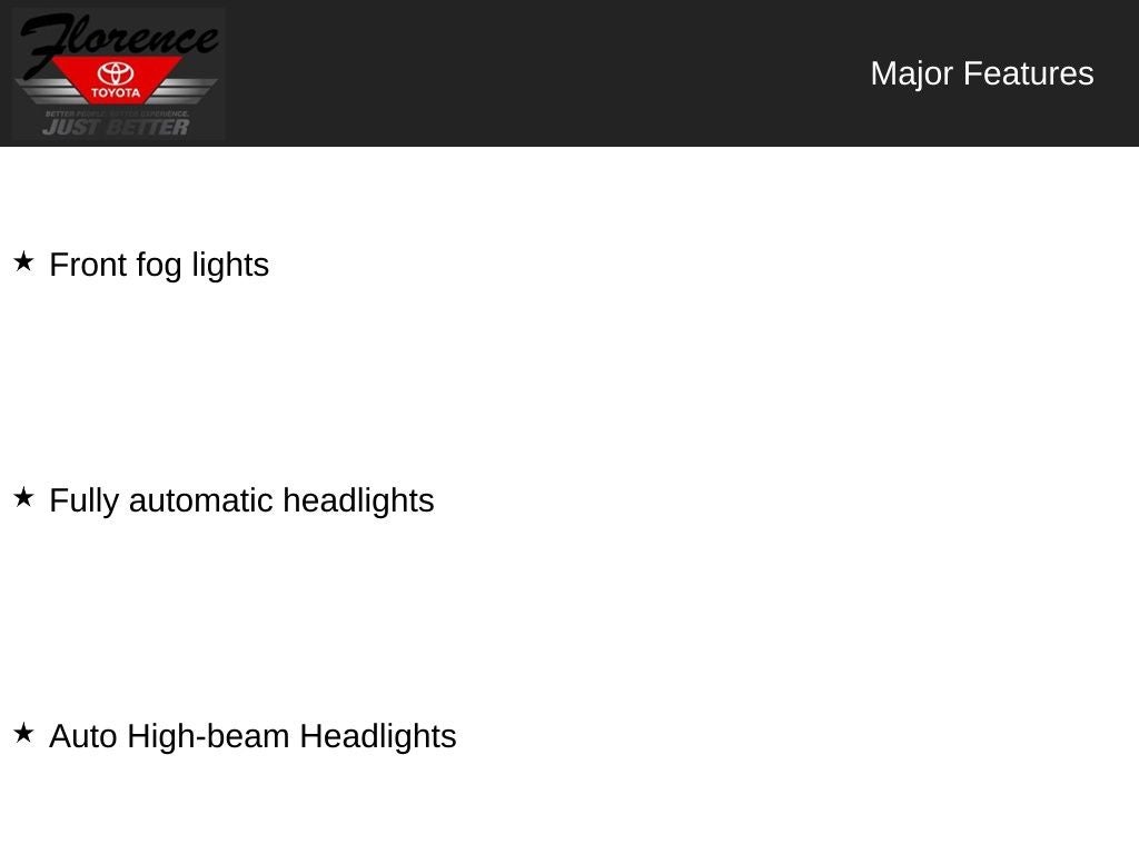 At Florence Toyota, come see how our USED CARS are JUST BETTER. We offer the following benefits: Lifetime Power Train (Some exclusions apply), 1st Year Maintenance, $500 Additional Trade In Appraisal, 72 Hour Vehicle Exchange Program, Yearly Vehicle Appraisal & Safety Inspection, VIP Loyalty Program, Routine Express Service, Courtesy Service Shuttle, Express Buying Service. Also, as an added benefit, we will buy your vehicle even if you don't buy ours!! Call today (866)830-0793 or visit us at www.florencetoyota.com *Customer must trade-in a vehicle to receive $1,000 Trade Assist credit that is included in the online price. **Financing must be provided by a third-party lender using this dealership's assistance for Customer to receive $1,000 Financing Assist credit that is included in the online price. See dealer for complete details.