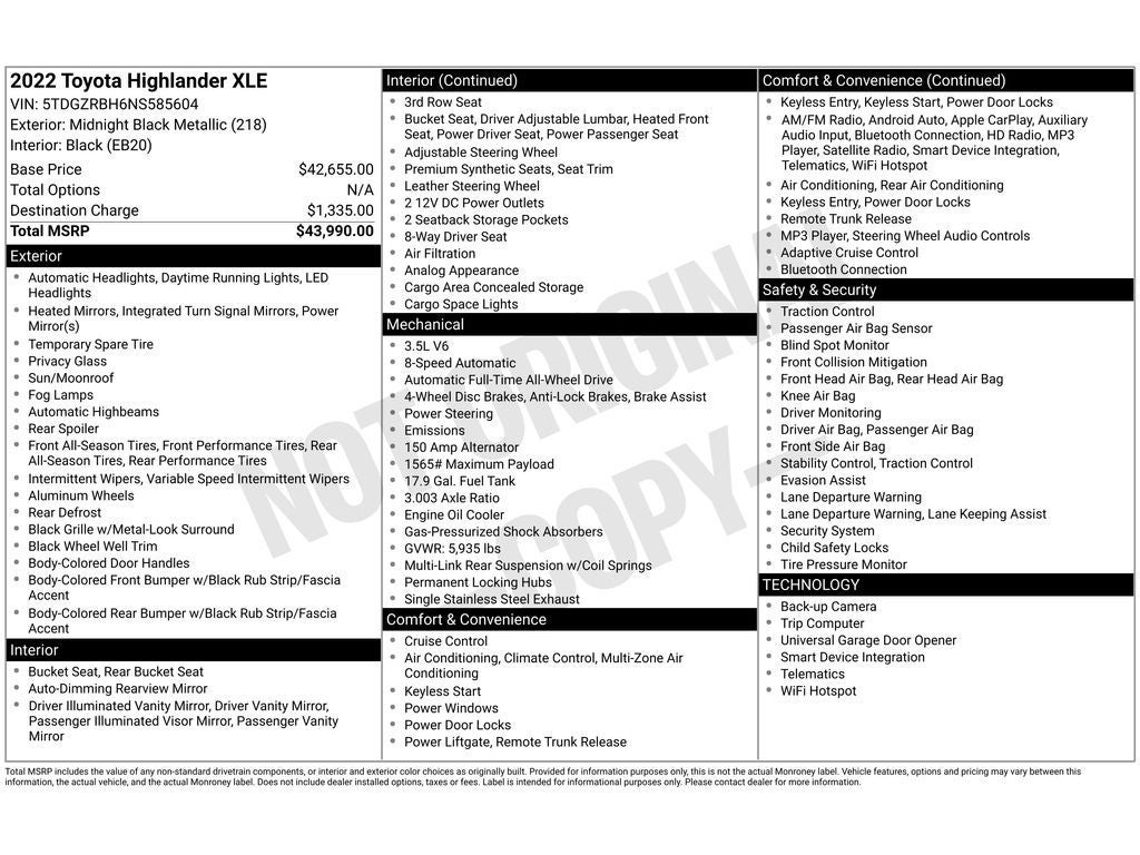 Conquer any rainy, snowy, or icy road conditions this winter with the all wheel drive system on the Toyota Highlander. This unit offers Android Auto for seamless smartphone integration. Apple CarPlay: Seamless smartphone integration for this mid-size suv - stay connected and entertained on the go! The vehicle keeps you comfortable with Auto Climate. Protect this mid-size suv from unwanted accidents with a cutting edge backup camera system. This 2022 Toyota Highlander enhances safety with a blind spot monitor, alerting drivers to potential dangers in adjacent lanes. This vehicle is a certified CARFAX 1-owner. The vehicle's Cross-Traffic Alert: Safeguarding you from unexpected traffic when reversing. This 2022 Toyota Highlander has a V6, 3.5L high output engine. This model has fog lights for all weather conditions. This unit features a hands-free Bluetooth® phone system. The leather seats in this Toyota Highlander are a must for buyers looking for comfort, durability, and style. With the adjustable lumbar support in this mid-size suv your back will love you. Load groceries and much more with ease into it thanks to the power liftgate.