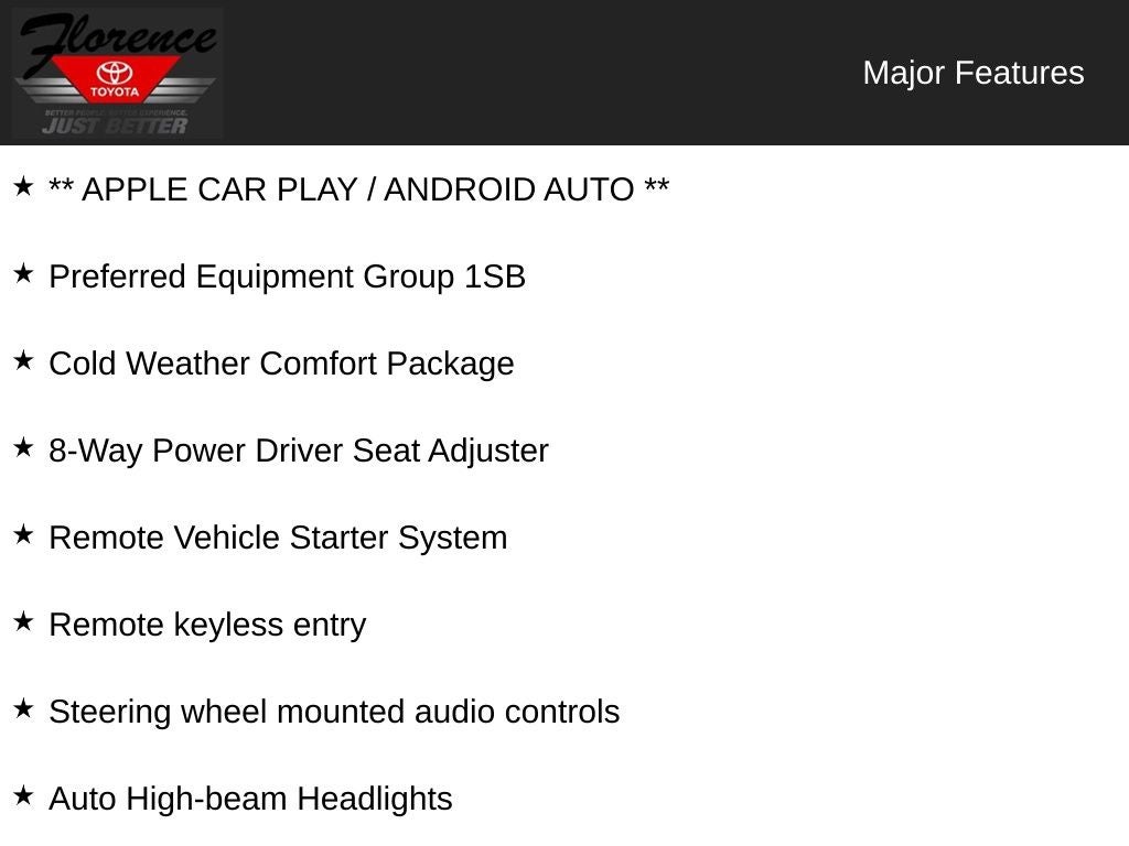 At Florence Toyota come see how our USED CARS are JUST BETTER . We offer the following benefits: Lifetime Power Train (Some exclusions apply), 1st Year Maintenance, $500 Additional Trade In Appraisal, 72 Hour Vehicle Exchange Program, Yearly Vehicle Appraisal & Safety Inspection, VIP Loyalty Program, Routine Express Service, Courtesy Service Shuttle, Express Buying Service. Also, as an added benefit we will buy your vehicle even if you don't buy ours!! Call today (866)830-0793 or visit us at www.florencetoyota.com *Customer must trade-in a vehicle to receive $1,000 Trade Assist credit that is included in the online price. **Financing must be provided by a third-party lender using this dealership’s assistance for Customer to receive $1,000 Financing Assist credit that is included in the online price. See dealer for complete details.