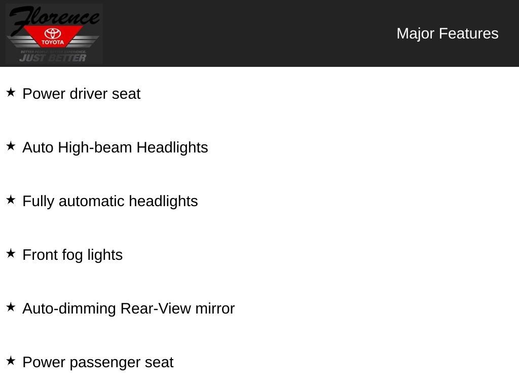 At Florence Toyota come see how our USED CARS are JUST BETTER. We offer the following benefits: Lifetime Power Train (Some exclusions apply), 1st Year Maintenance, $500 Additional Trade In Appraisal, 72 Hour Vehicle Exchange Program, Yearly Vehicle Appraisal & Safety Inspection, VIP Loyalty Program, Routine Express Service, Courtesy Service Shuttle, Express Buying Service. Also, as an added benefit we will buy your vehicle even if you don't buy ours!! Call today (866)830-0793 or visit us at www.florencetoyota.com *Customer must trade-in a vehicle to receive $1,000 Trade Assist credit that is included in the online price. **Financing must be provided by a third-party lender using this dealership's assistance for Customer to receive $1,000 Financing Assist credit that is included in the online price. See dealer for complete details.