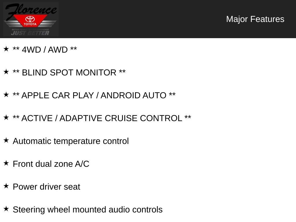 At Florence Toyota, come see how our USED CARS are JUST BETTER. We offer the following benefits: Lifetime Power Train (Some exclusions apply), 1st Year Maintenance, $500 Additional Trade In Appraisal, 72 Hour Vehicle Exchange Program, Yearly Vehicle Appraisal & Safety Inspection, VIP Loyalty Program, Routine Express Service, Courtesy Service Shuttle, Express Buying Service. Also, as an added benefit, we will buy your vehicle even if you don't buy ours!! Call today (866)830-0793 or visit us at www.florencetoyota.com *Customer must trade-in a vehicle to receive $1,000 Trade Assist credit that is included in the online price. **Financing must be provided by a third-party lender using this dealership's assistance for Customer to receive $1,000 Financing Assist credit that is included in the online price. See dealer for complete details.