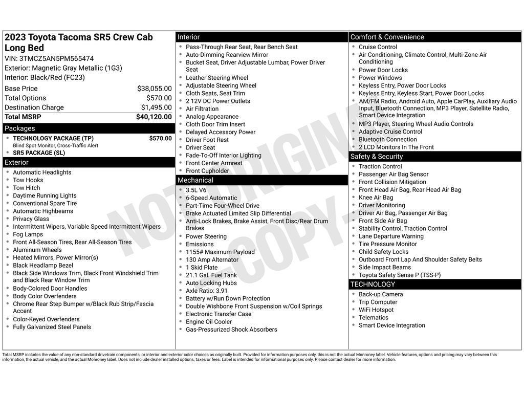 SR5 Package: All Content Included as Standard Equipment: Power Sliding Rear Window with Privacy Glass; Front Door Smart Key System with Push Button Start; Color-Keyed Overfenders; Daytime Running Lamps; Front Fog and Driving Lamp; P245/75R16 All-Season Tires; Charcoal Grille with Chrome Surround; 16" Dark Gray Alloy Wheels; Black Headlamp Bezel; Front Seats Technology Package: Blind Spot Monitor with Rear Cross Traffic Alert (Requires Colored Keyed Rear Bumper): Blind Spot Monitor with Rear Cross Traffic Alert **Equipment listed is based on original vehicle build and subject to change. Please confirm the accuracy of the included equipment by calling the dealer prior to purchase.**