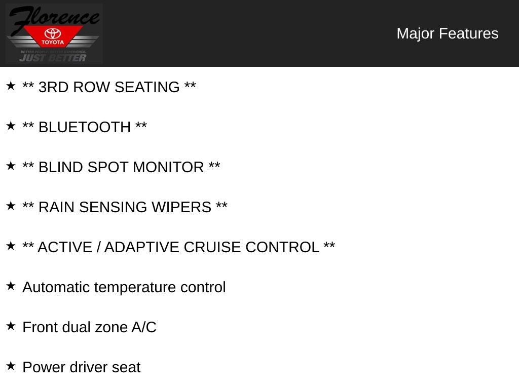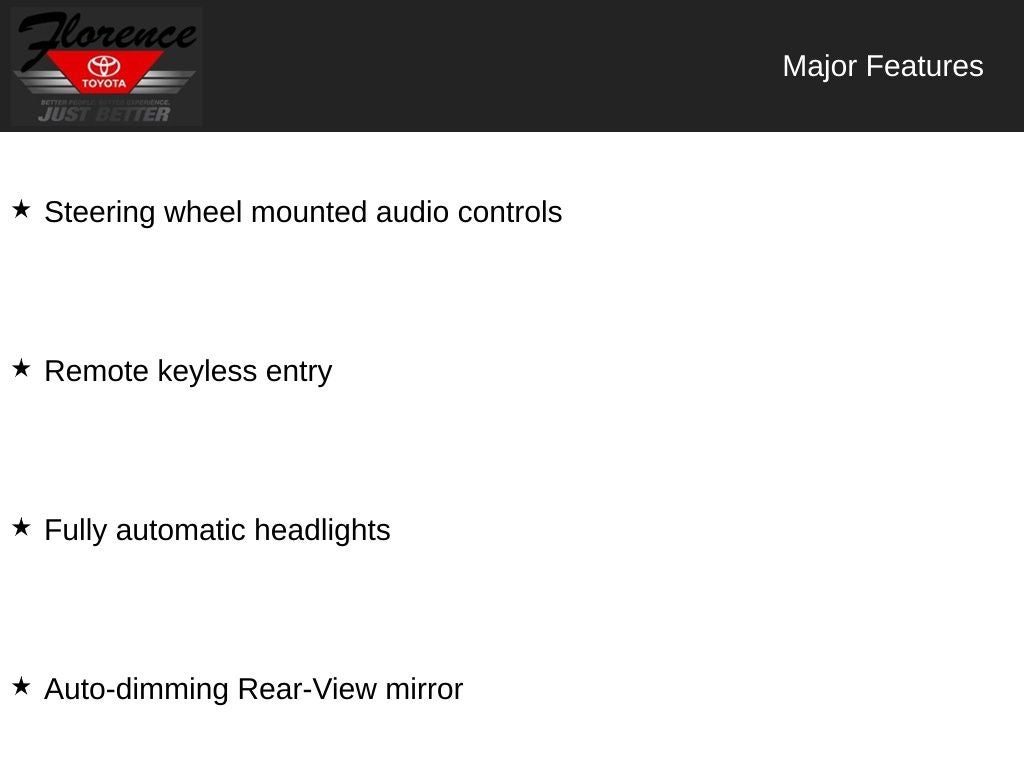 At Florence Toyota come see how our USED CARS are JUST BETTER. We offer the following benefits: Lifetime Power Train (Some exclusions apply), 1st Year Maintenance, $500 Additional Trade In Appraisal, 72 Hour Vehicle Exchange Program, Yearly Vehicle Appraisal & Safety Inspection, VIP Loyalty Program, Routine Express Service, Courtesy Service Shuttle, Express Buying Service. Also, as an added benefit we will buy your vehicle even if you don't buy ours!! Call today (866)830-0793 or visit us at www.florencetoyota.com *Customer must trade-in a vehicle to receive $1,000 Trade Assist credit that is included in the online price. **Financing must be provided by a third-party lender using this dealership's assistance for Customer to receive $1,000 Financing Assist credit that is included in the online price. See dealer for complete details.