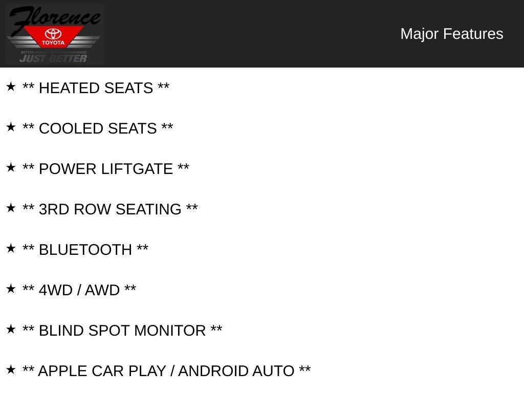 At Florence Toyota come see how our USED CARS are JUST BETTER . We offer the following benefits: Lifetime Power Train (Some exclusions apply), 1st Year Maintenance, $500 Additional Trade In Appraisal, 72 Hour Vehicle Exchange Program, Yearly Vehicle Appraisal & Safety Inspection, VIP Loyalty Program, Routine Express Service, Courtesy Service Shuttle, Express Buying Service. Also, as an added benefit we will buy your vehicle even if you don't buy ours!! Call today (866)830-0793or visit us at www.florencetoyota.com *Customer must trade-in a vehicle to receive $1,000 Trade Assist credit that is included in the online price. **Financing must be provided by a third-party lender using this dealership’s assistance for Customer to receive $1,000 Financing Assist credit that is included in the online price. See dealer for complete details.