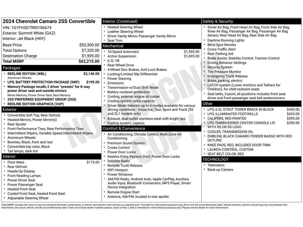 Redline Edition: Redline Edition Graphics; Red Knee Pads; 20" X 8.5" Front and 20" X 9.5" Rear Aluminum Wheels; Black Camaro Emblem Fender Badge with Red Outline; Red Seat Belt Color. Preferred Equipment Group 2SS. Magnetic Ride Control. Black 6.2L Strut Tower Brace. Illuminated Footwells. Red-Painted Calipers. Red Knee Pads. Embroidered Center Console Lid with SS Logo. Red Seat Belt Color. All-Weather Floor Mats. **Equipment listed is based on original vehicle build and subject to change. Please confirm the accuracy of the included equipment by calling the dealer prior to purchase.**