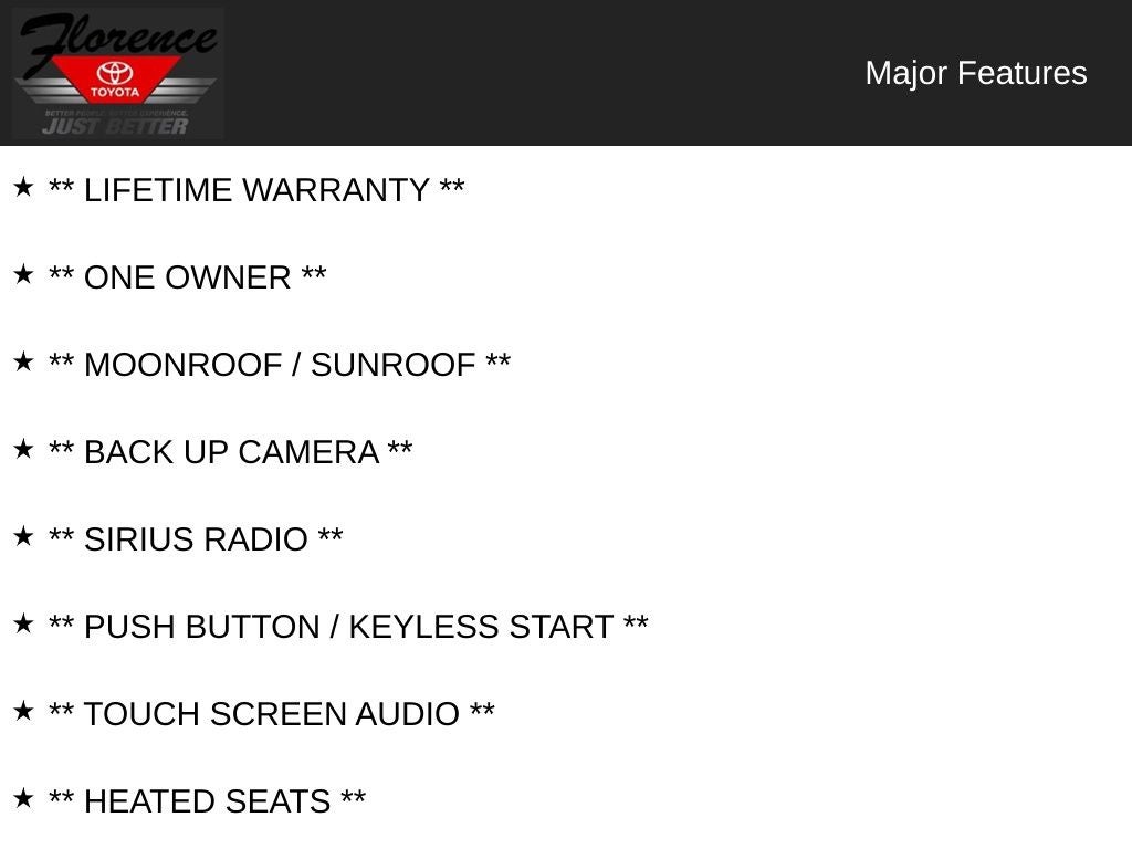 At Florence Toyota, we are committed to delivering an exceptional customer experience. Come see how our USED CARS are JUST BETTER. We offer a Lifetime Power Train Warranty, 1st Year Maintenance, $500 Additional Trade-In Appraisal, and more. Call today (866)830-0793 or visit us at www.florencetoyota.com to experience the difference.
