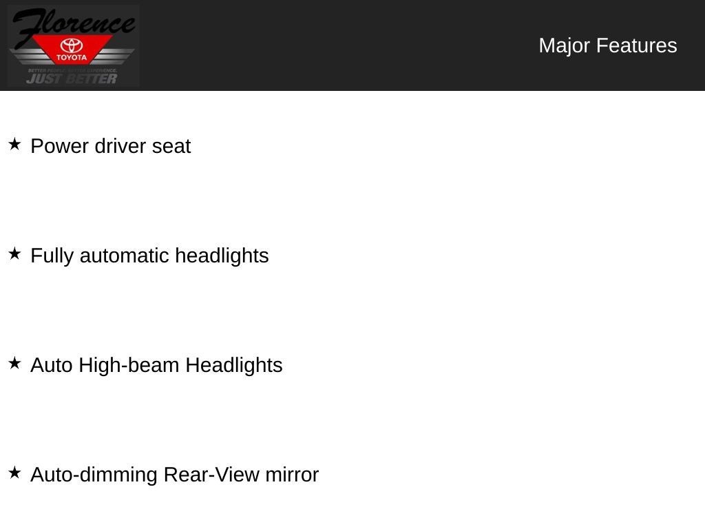At Florence Toyota come see how our USED CARS are JUST BETTER. We offer the following benefits: Lifetime Power Train (Some exclusions apply), 1st Year Maintenance, $500 Additional Trade In Appraisal, 72 Hour Vehicle Exchange Program, Yearly Vehicle Appraisal & Safety Inspection, VIP Loyalty Program, Routine Express Service, Courtesy Service Shuttle, Express Buying Service. Also, as an added benefit we will buy your vehicle even if you don't buy ours!! Call today (866)830-0793 or visit us at www.florencetoyota.com *Customer must trade-in a vehicle to receive $1,000 Trade Assist credit that is included in the online price. **Financing must be provided by a third-party lender using this dealership's assistance for Customer to receive $1,000 Financing Assist credit that is included in the online price. See dealer for complete details.