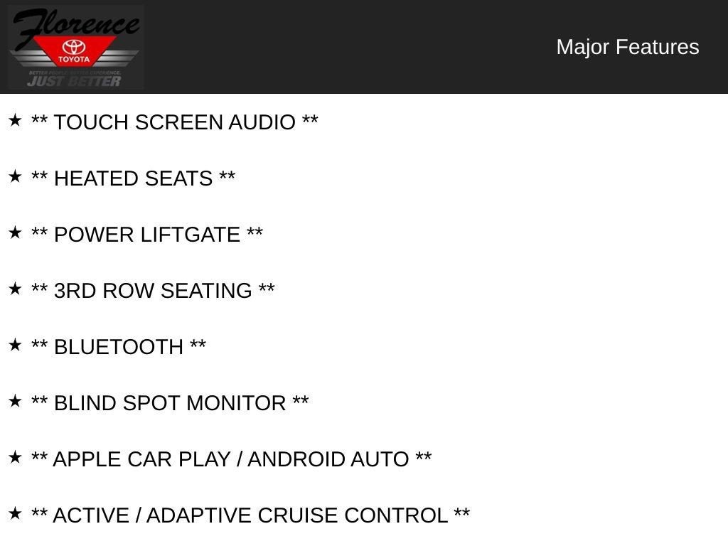 2024 Toyota Grand Highlander XLE - located in Florence, SC. This gently pre-owned SUV offers low mileage at 23,888 miles and combines spacious comfort with efficient performance. Powered by a 4-cylinder 2.4L gasoline engine and front-wheel drive, it delivers a refined ride, strong fuel economy, and responsive handling for city commutes and family road trips. The XLE trim includes sought-after convenience and safety features: Hands-Free Bluetooth® for seamless smartphone integration, a Back-Up Camera for confident parking and reversing, and a Blind Spot Monitor to help you change lanes with added awareness. Built-in Navigation keeps you on course without relying solely on your phone. This vehicle is a CARFAX 1-Owner unit, giving you added peace of mind about its history and care. Inside, you'll find a thoughtfully designed cabin with comfortable seating for passengers, versatile cargo space, and premium materials that elevate daily driving. Practical technology and driver-assist systems enhance both convenience and safety, making this Toyota Grand Highlander an ideal choice for families, commuters, and anyone seeking a reliable, modern SUV. Located in Florence, SC - schedule a test drive today to experience the smooth performance and low-mileage condition of this 2024 Toyota Grand Highlander XLE firsthand.