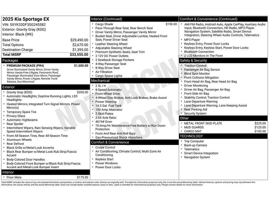 Premium Package: Illuminated Dual Vanity Mirrors; LED Interior Lighting; Smart Power Liftgate; Panoramic Sunroof. Gravity Gray. Metal Front Skid Plate. Carpeted Floor Mats. Cargo Cover. Mud Guards. Cargo Mat. **Equipment listed is based on original vehicle build and subject to change. Please confirm the accuracy of the included equipment by calling the dealer prior to purchase.**
