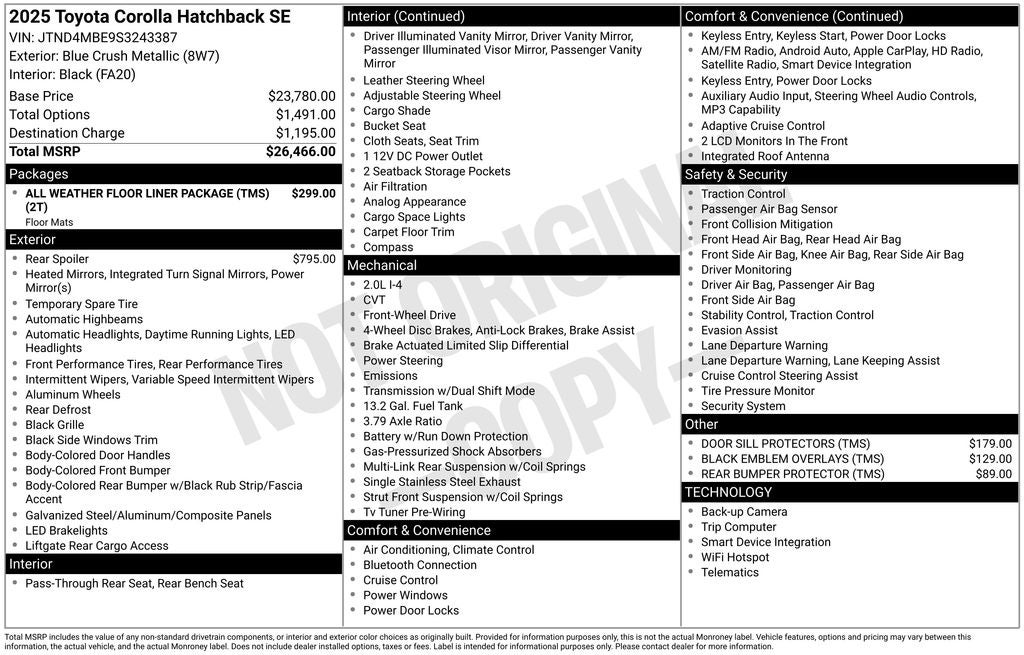 Beyond the impressive list of features, this Corolla Hatchback SE also boasts a range of premium accessories that enhance both its style and functionality. These include a GR Rear Window Spoiler, All-Weather Floor Liner Package, Door Sill Protectors, Black Emblem Overlays, and a Rear Bumper Protector.