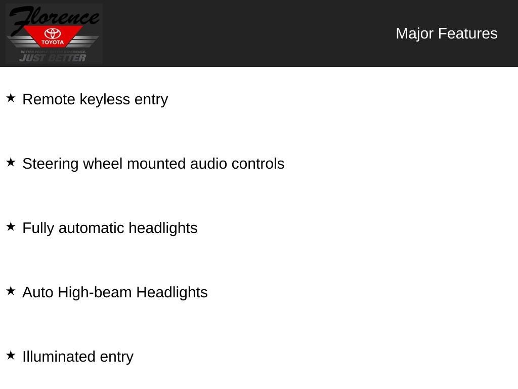 At Florence Toyota come see how our USED CARS are JUST BETTER . We offer the following benefits: Lifetime Power Train (Some exclusions apply), 1st Year Maintenance, $500 Additional Trade In Appraisal, 72 Hour Vehicle Exchange Program, Yearly Vehicle Appraisal & Safety Inspection, VIP Loyalty Program, Routine Express Service, Courtesy Service Shuttle, Express Buying Service. Also, as an added benefit we will buy your vehicle even if you don't buy ours!! Call today (866)830-0793or visit us at www.florencetoyota.com *Customer must trade-in a vehicle to receive $1,000 Trade Assist credit that is included in the online price. **Financing must be provided by a third-party lender using this dealership’s assistance for Customer to receive $1,000 Financing Assist credit that is included in the online price. See dealer for complete details.