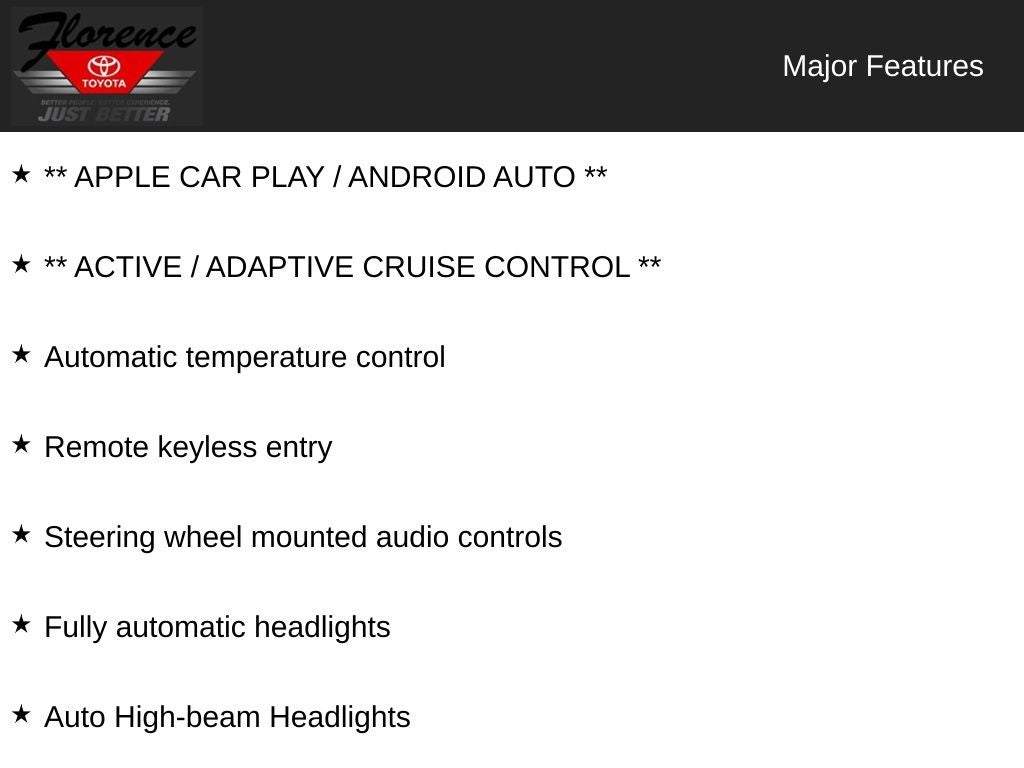 At Florence Toyota, we take pride in offering our customers the highest quality used vehicles on the market. Come see how our USED CARS are JUST BETTER. We offer the following benefits: Lifetime Power Train (Some exclusions apply), 1st Year Maintenance, $500 Additional Trade In Appraisal, 72 Hour Vehicle Exchange Program, Yearly Vehicle Appraisal & Safety Inspection, VIP Loyalty Program, Routine Express Service, Courtesy Service Shuttle, Express Buying Service. Also, as an added benefit we will buy your vehicle even if you don't buy ours!! Call today (866)830-0793 or visit us at www.florencetoyota.com *Customer must trade-in a vehicle to receive $1,000 Trade Assist credit that is included in the online price. **Financing must be provided by a third-party lender using this dealership's assistance for Customer to receive $1,000 Financing Assist credit that is included in the online price. See dealer for complete details.