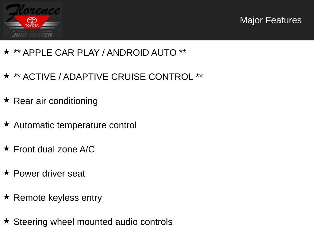 At Florence Toyota, come see how our USED CARS are JUST BETTER. We offer the following benefits: Lifetime Power Train (Some exclusions apply), 1st Year Maintenance, $500 Additional Trade In Appraisal, 72 Hour Vehicle Exchange Program, Yearly Vehicle Appraisal & Safety Inspection, VIP Loyalty Program, Routine Express Service, Courtesy Service Shuttle, Express Buying Service. Also, as an added benefit, we will buy your vehicle even if you don't buy ours!! Call today (866)830-0793 or visit us at www.florencetoyota.com *Customer must trade-in a vehicle to receive $1,000 Trade Assist credit that is included in the online price. **Financing must be provided by a third-party lender using this dealership's assistance for Customer to receive $1,000 Financing Assist credit that is included in the online price. See dealer for complete details.