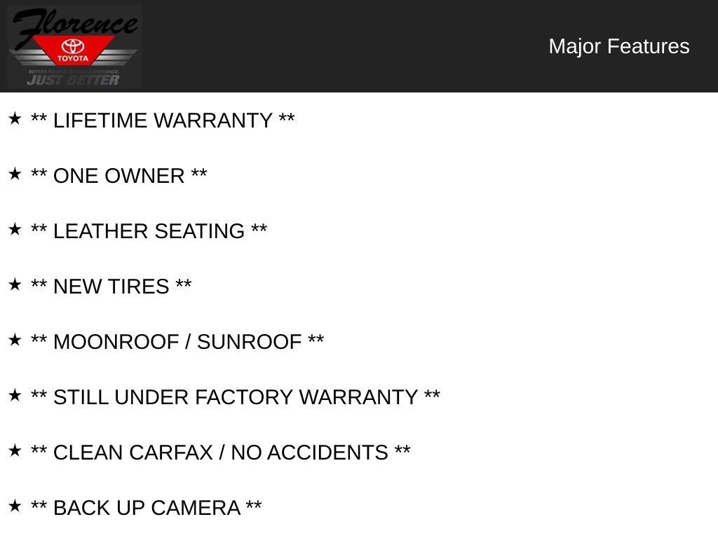 At Florence Toyota, come see how our USED CARS are JUST BETTER. We offer the following benefits: Lifetime Power Train (Some exclusions apply), 1st Year Maintenance, $500 Additional Trade In Appraisal, 72 Hour Vehicle Exchange Program, Yearly Vehicle Appraisal & Safety Inspection, VIP Loyalty Program, Routine Express Service, Courtesy Service Shuttle, Express Buying Service. Also, as an added benefit we will buy your vehicle even if you don't buy ours!! Call today (866)830-0793 or visit us at www.florencetoyota.com *Customer must trade-in a vehicle to receive $1,000 Trade Assist credit that is included in the online price. **Financing must be provided by a third-party lender using this dealership's assistance for Customer to receive $1,000 Financing Assist credit that is included in the online price. See dealer for complete details.