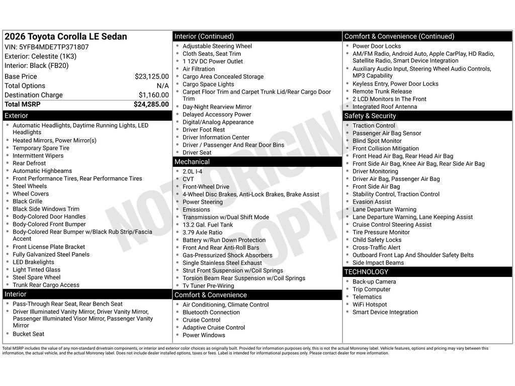 This Toyota Corolla also carries a CARFAX 1-Owner history, providing added assurance of careful ownership and documented service. With low miles and a comprehensive suite of convenience and safety technology, this 2026 Toyota Corolla LE represents smart value and peace of mind.